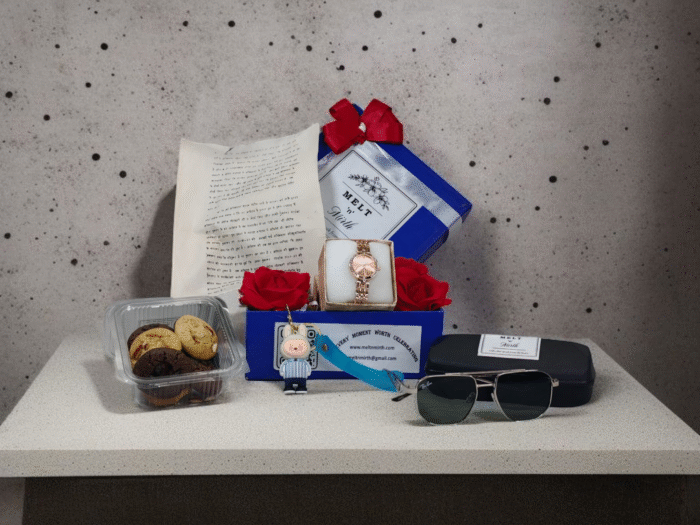 Stylish gift box š with watch ā, sunglasses š¶ļø, keychain š, and homemade cookies šŖ ā perfect for birthdays, anniversaries, or special surprises.