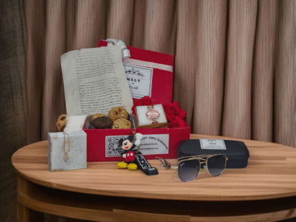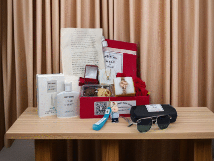 A charming gift box š featuring a stylish watch ā, perfume šø, chocolates š«, and cute accessories ⨠ā perfect for making someone feel truly special.