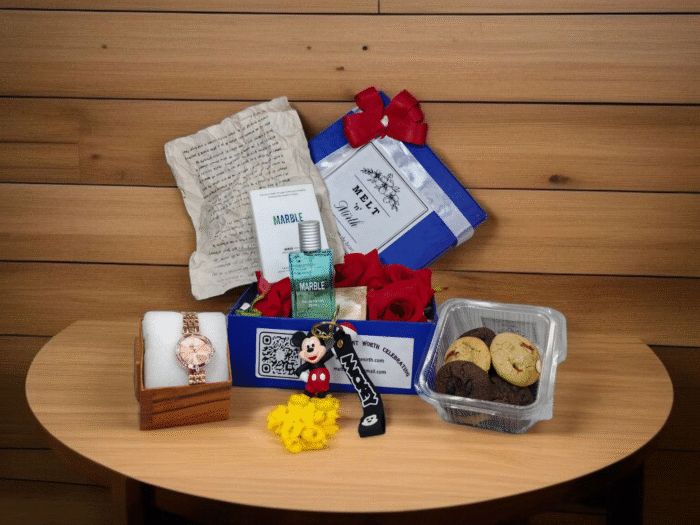 A charming gift box š featuring a stylish watch ā, perfume šø, chocolates š«, and cute accessories ⨠ā perfect for making someone feel truly special.