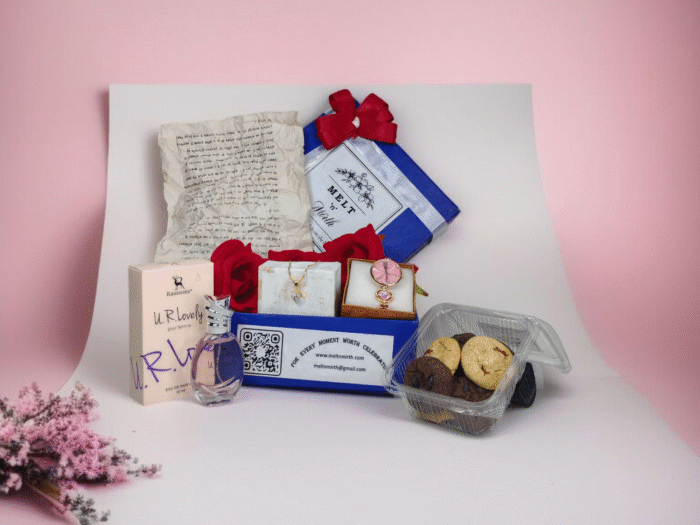Elegant gift box š with perfume šø, necklace š, watch ā, and SPR Homemade Cookies šŖ ā perfect for birthdays š, anniversaries š, and romantic occasions š.