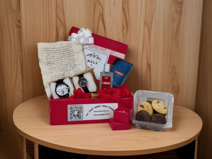 A charming gift box filled with timeless couple watches, SPR homemade cookies, and romantic touches ā perfect for celebrating your forever bond. āØ