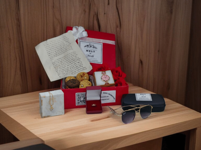 An elegant gift hamper š featuring a classic wristwatch ā, jewelry š, sunglasses š¶ļø, SPR homemade cookies šŖ, and a ring š ā the perfect blend of style, sweetness, and heartfelt sentiment.
